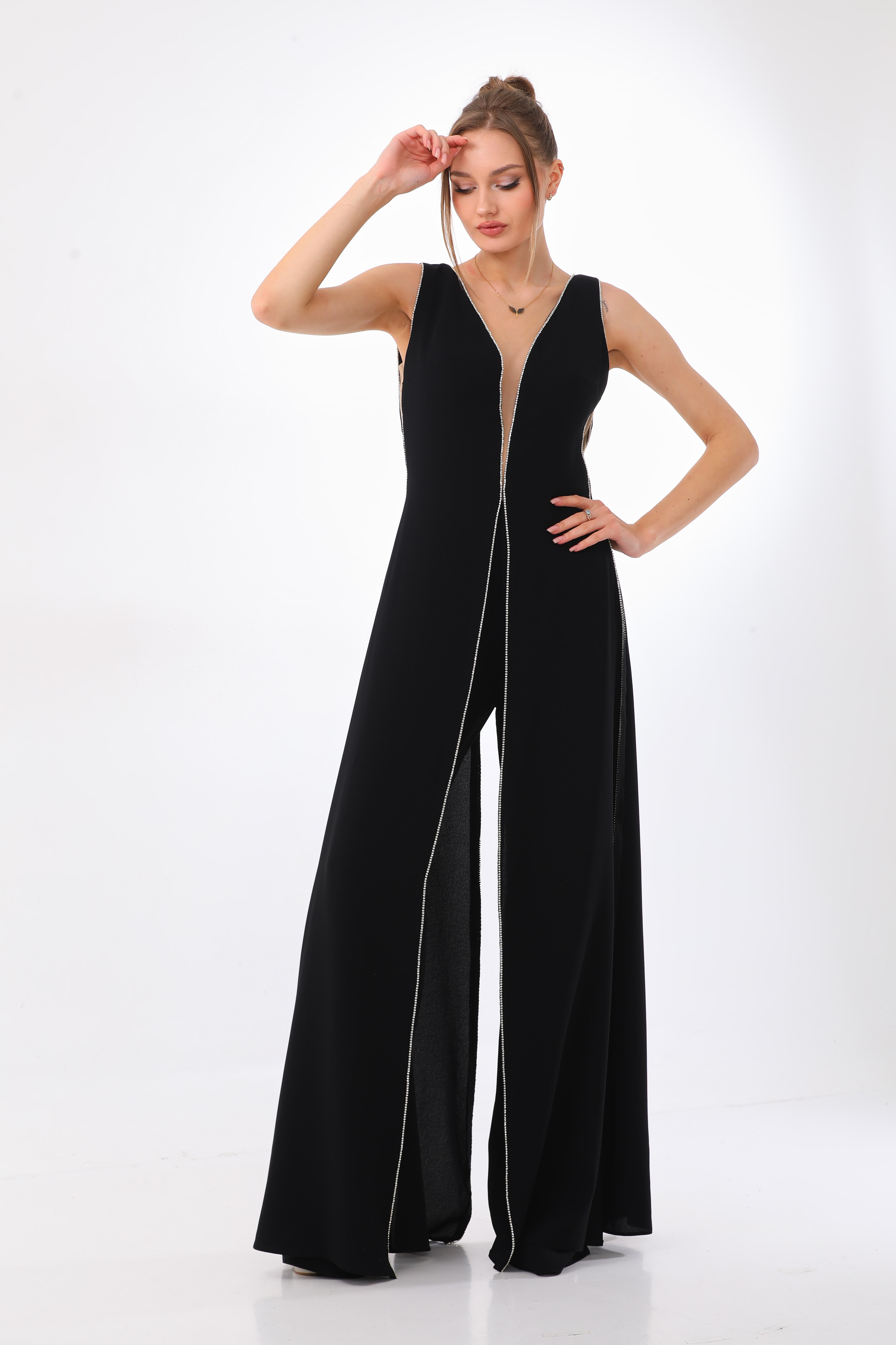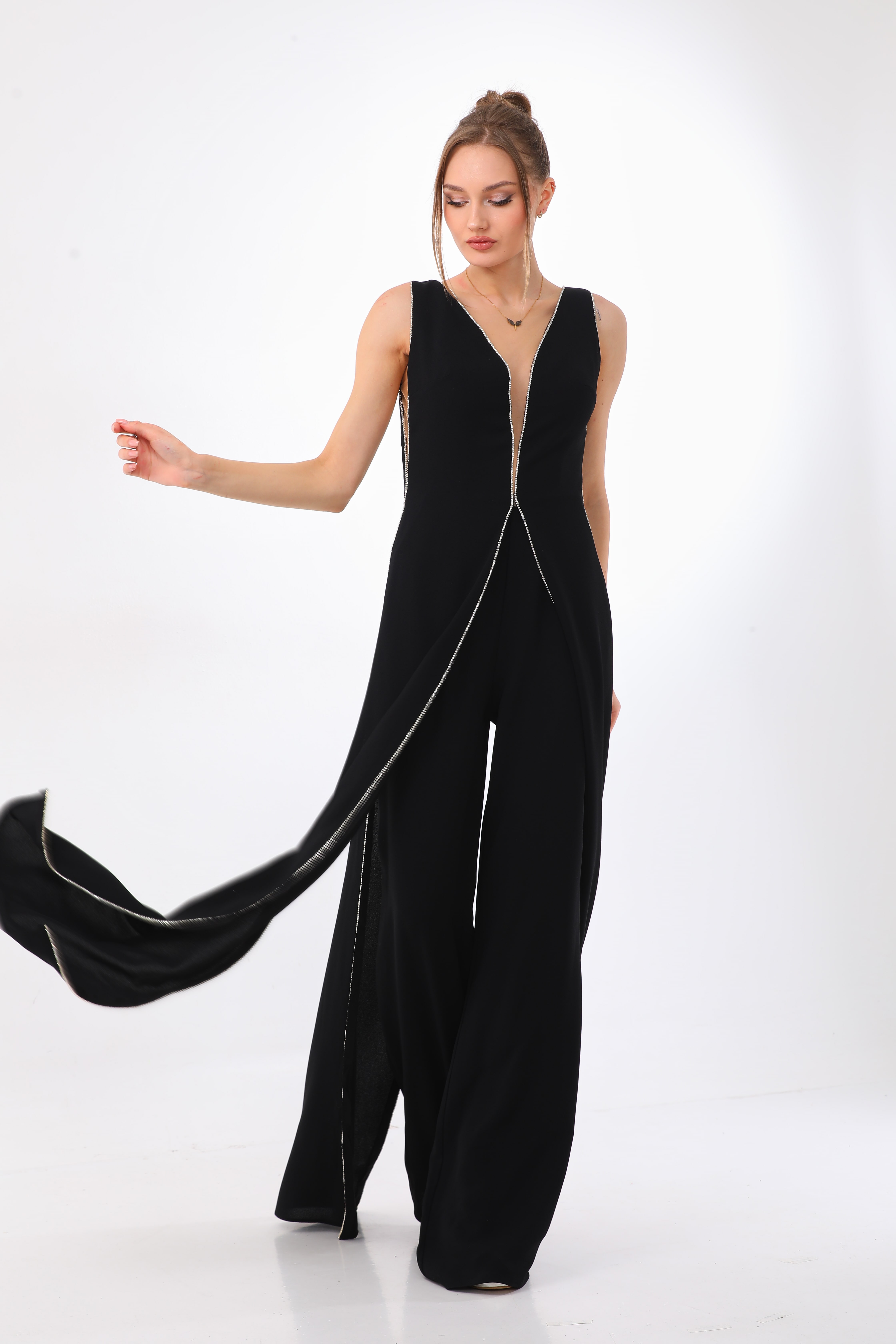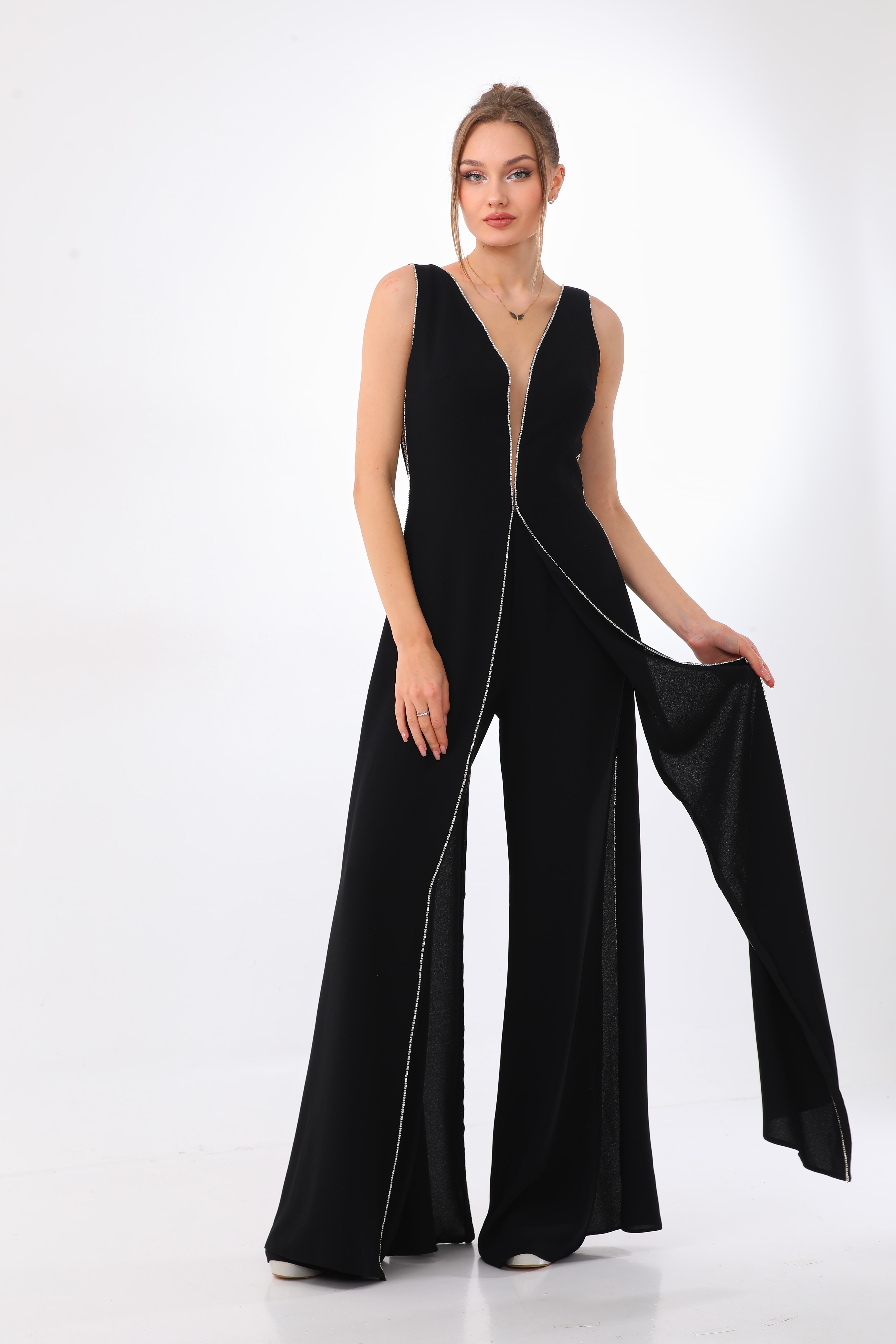 With an alluring combination of mystery and romance, this jumpsuit is sure to turn heads. Its exaggerated V-neck effortlessly transitions into wide-legged pants, creating a dramatic and elegant look.