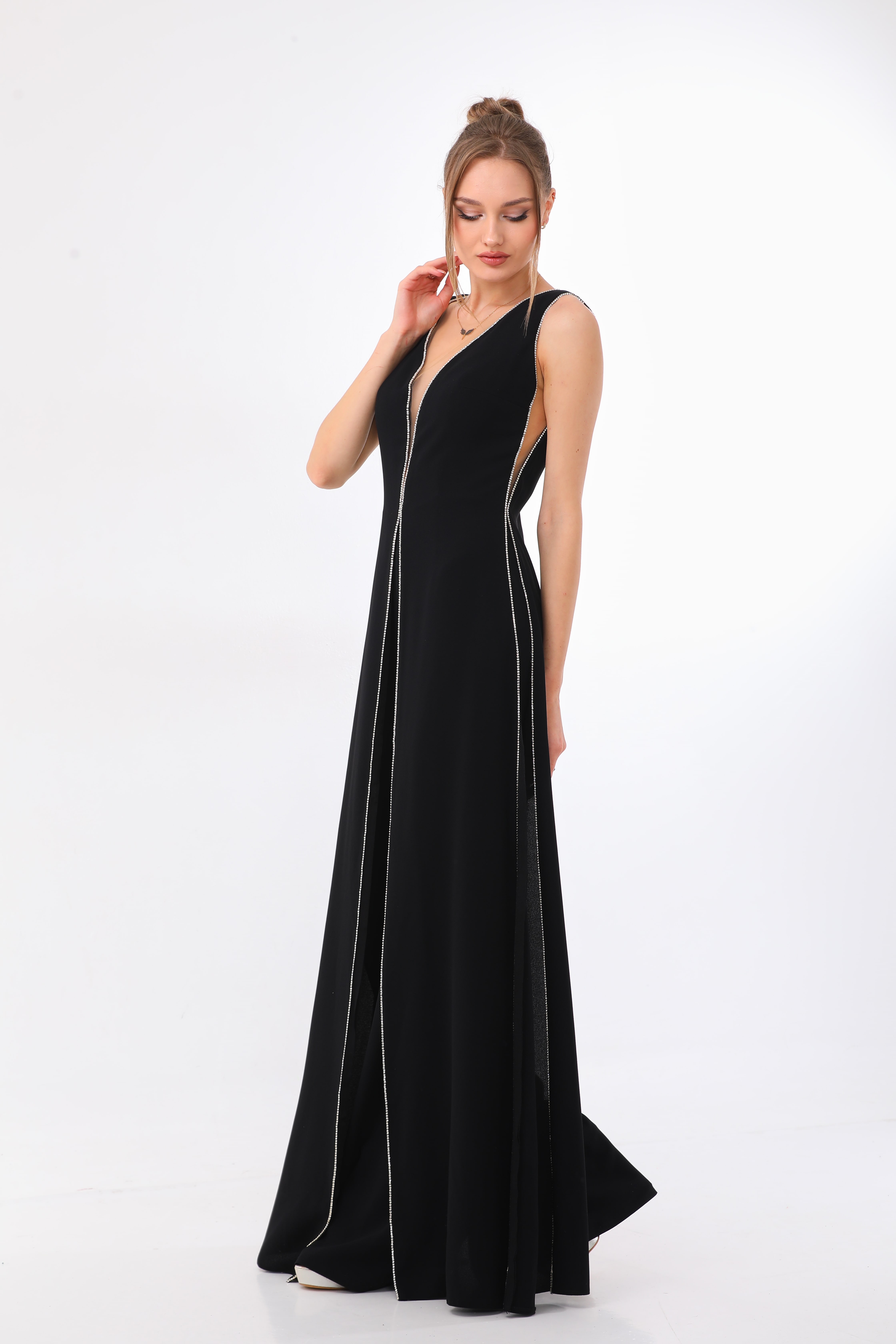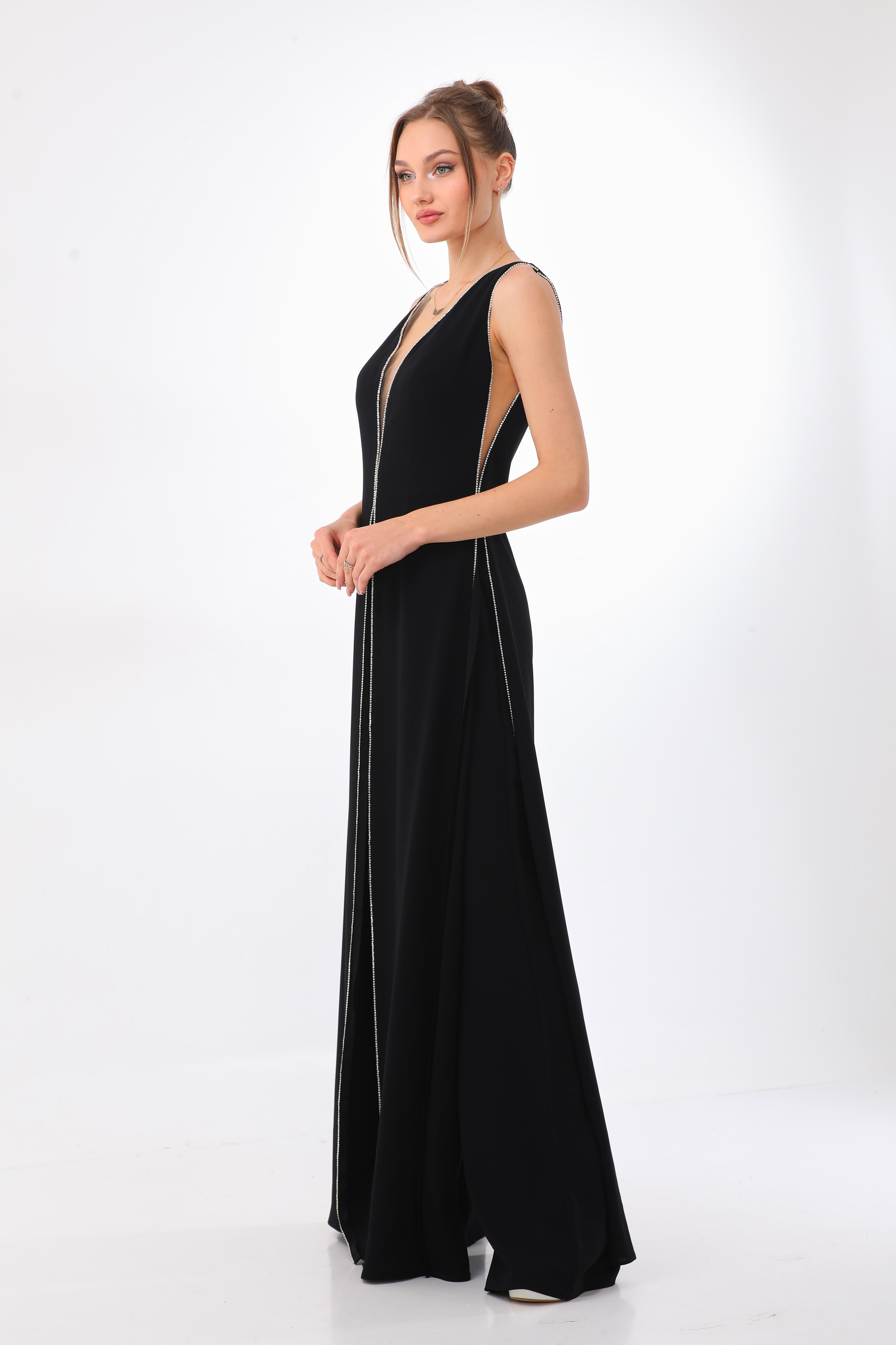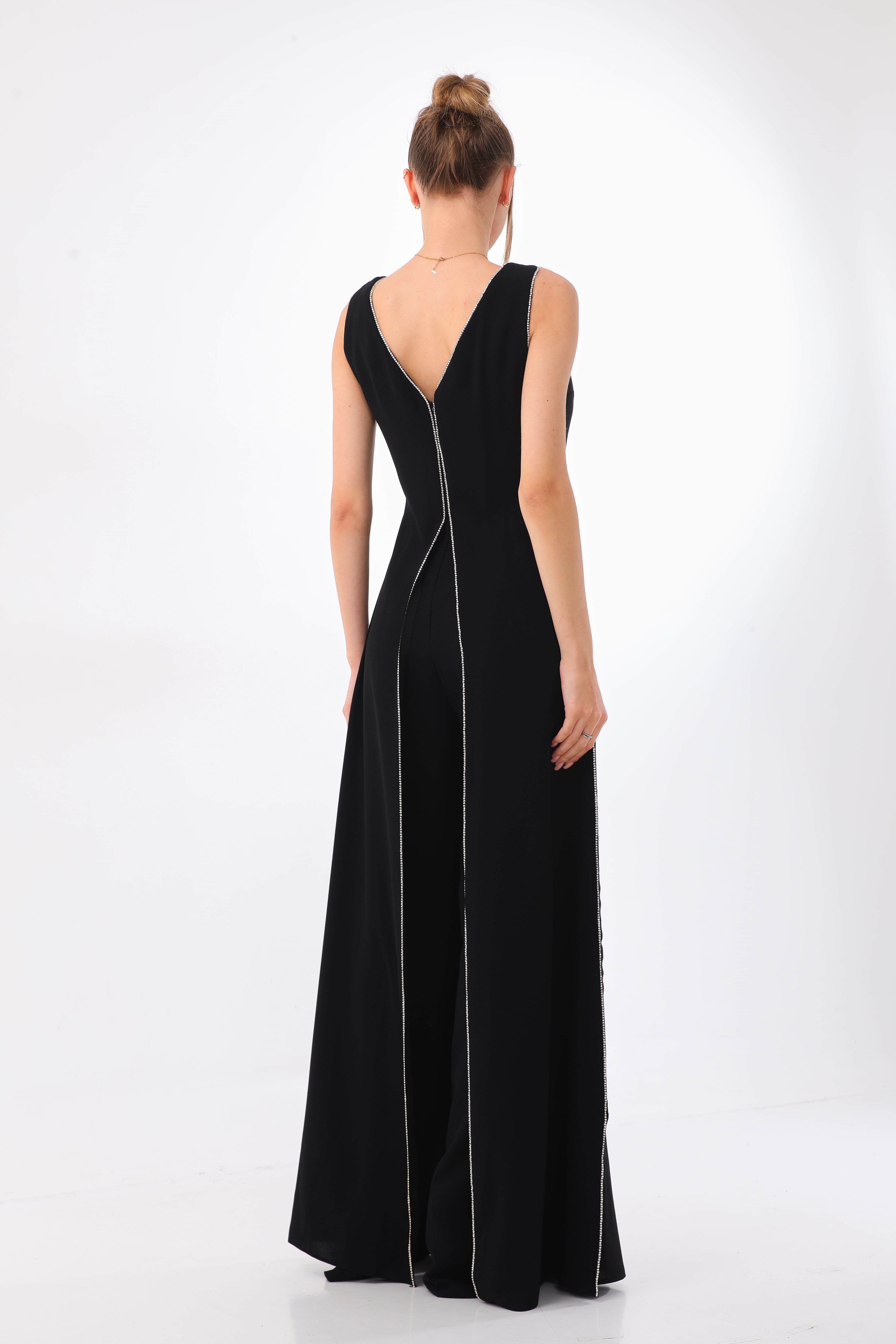 With an alluring combination of mystery and romance, this jumpsuit is sure to turn heads. Its exaggerated V-neck effortlessly transitions into wide-legged pants, creating a dramatic and elegant look.